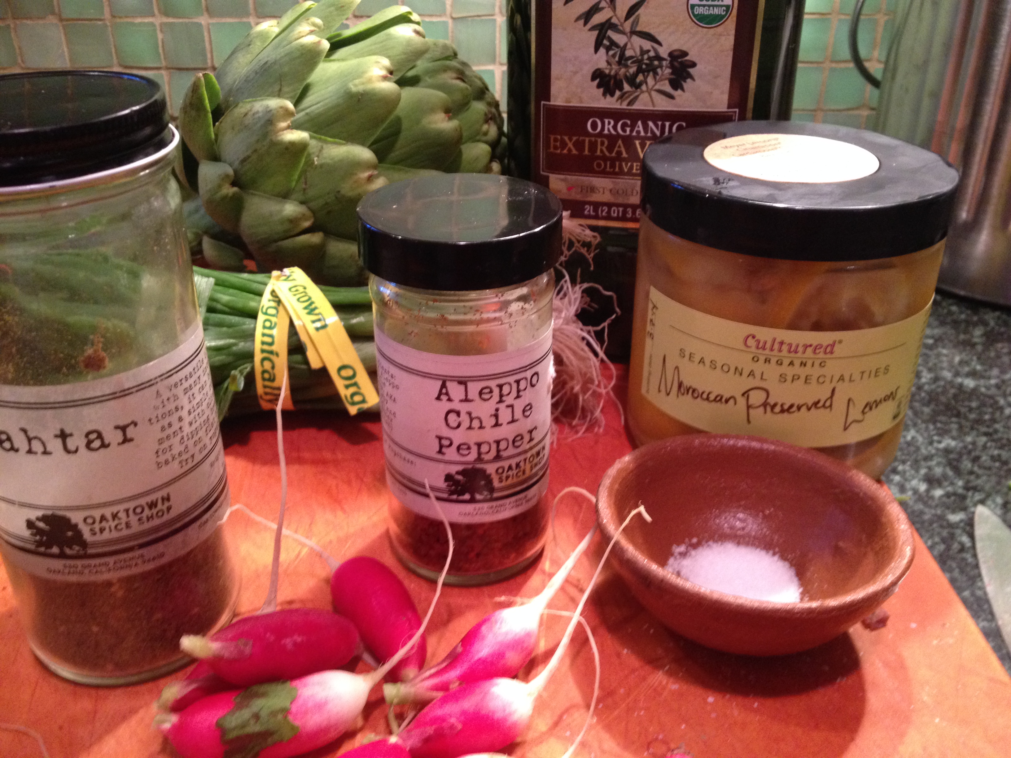 The beauty of this recipe is that there are endless variations. Instead of artichokes you can roast broccoli, cauliflower, or Brussel sprouts. Use spring onions or shallots in place of the radishes or scallions, change the spice mix, or add some cashews or almonds. The timing stays pretty much the same—25 minutes at 425°.