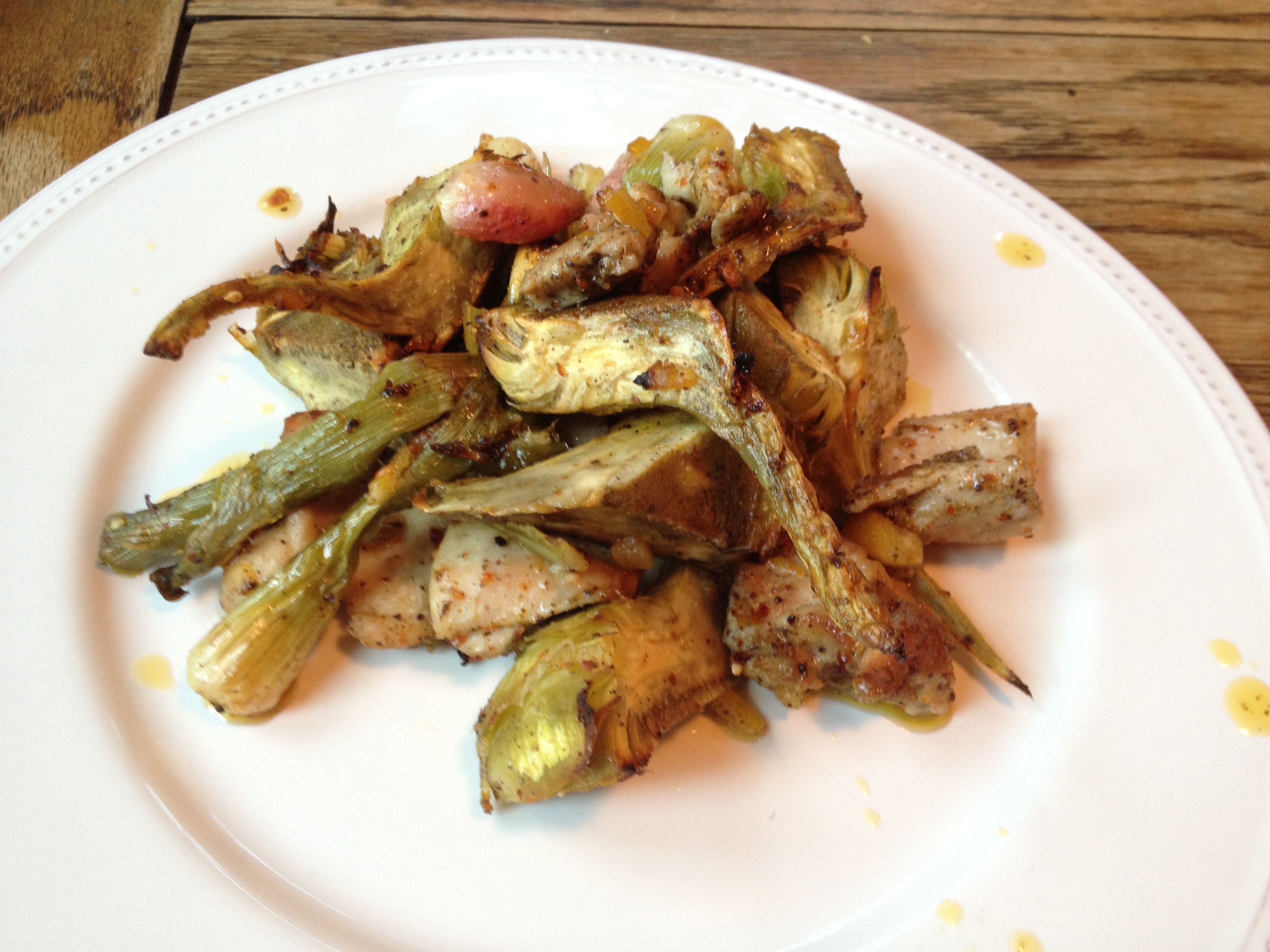 Cut the artichoke into quarters and cut out the choke with a knife and cut again into eighths. Add to bowl with olive oil and spices. Add radishes, scallions and chicken (if using) and toss to coat. Put on a sheet pan lined with parchment paper and roast for 25 minutes.