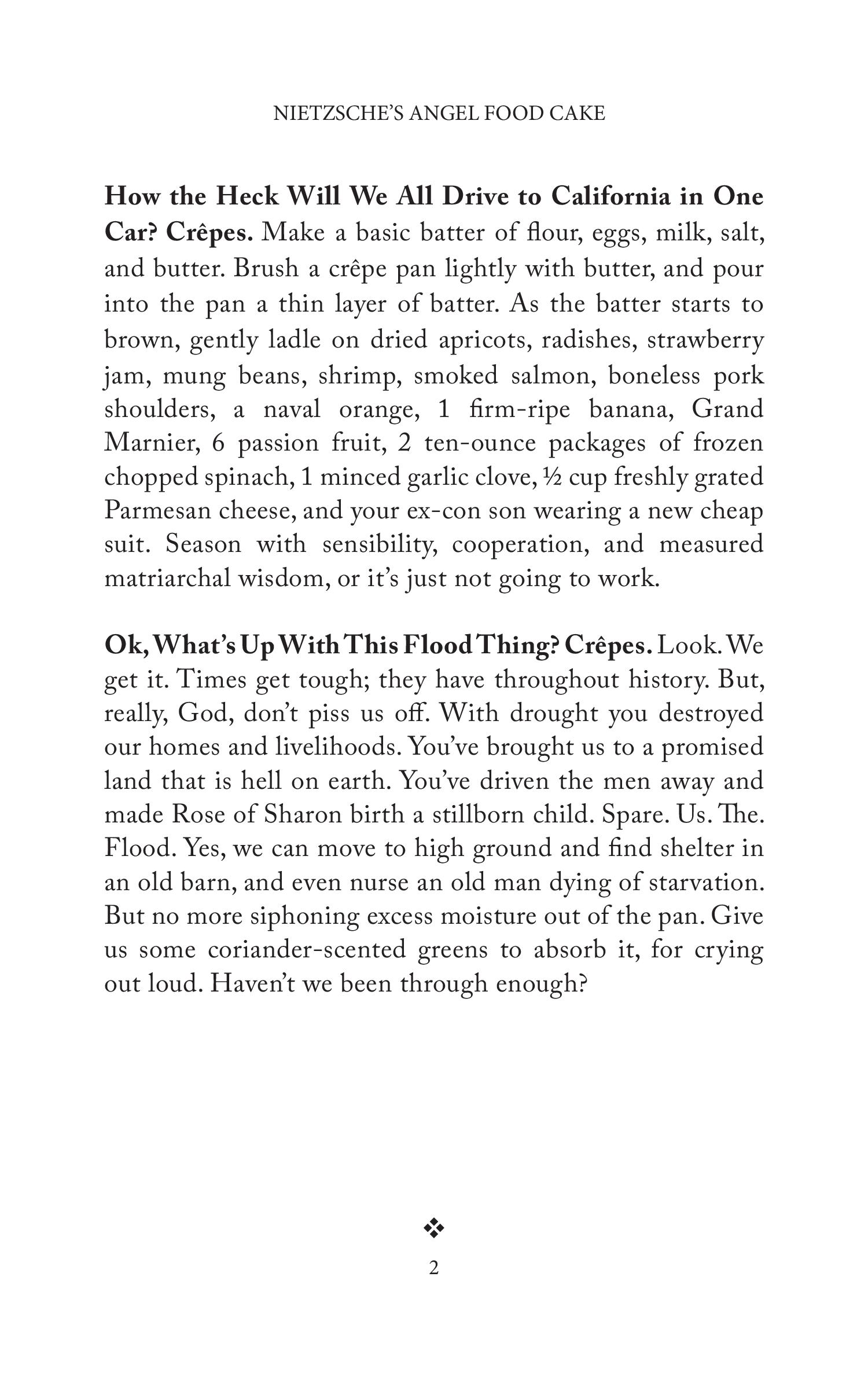 Literary humor for those who enjoy smashing idols fondly, “Nietzsche’s Angel Food Cake: And Other ‘Recipes’ for the Intellectually Famished” allows 22 cultural monoliths to share ”their” succulent recipes. For those who like cookery to insinuate the hard questions, it offers a funny, surprisingly informative, and entirely whirlwind tour of civilization. Not really a cookbook, it’s for lovers of literature, history, art, music, and philosophy, for foodies, and for anyone with a good liberal arts education, no matter how vaguely they remember it.