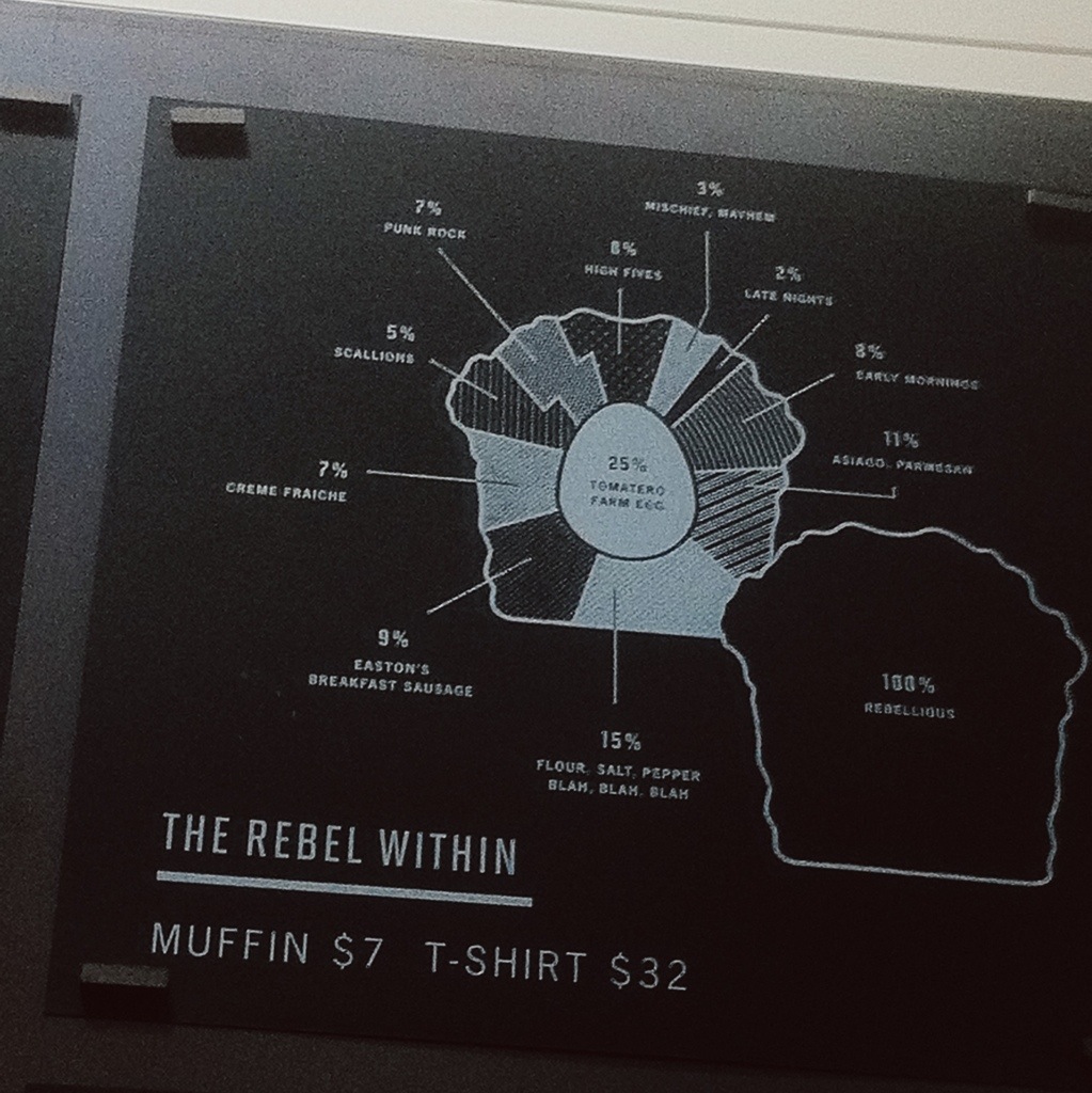 But that way lies madness. I’ve already left the house at the crack of dawn (well, for me, anyway) to be at Craftsman and Wolves for a second visit in order to purchase their signature item, The Rebel Within, a savory muffin—the batter enhanced with asiago cheese, pork sausage, green onion—that magically encases a soft-boiled egg with a still-runny yolk.