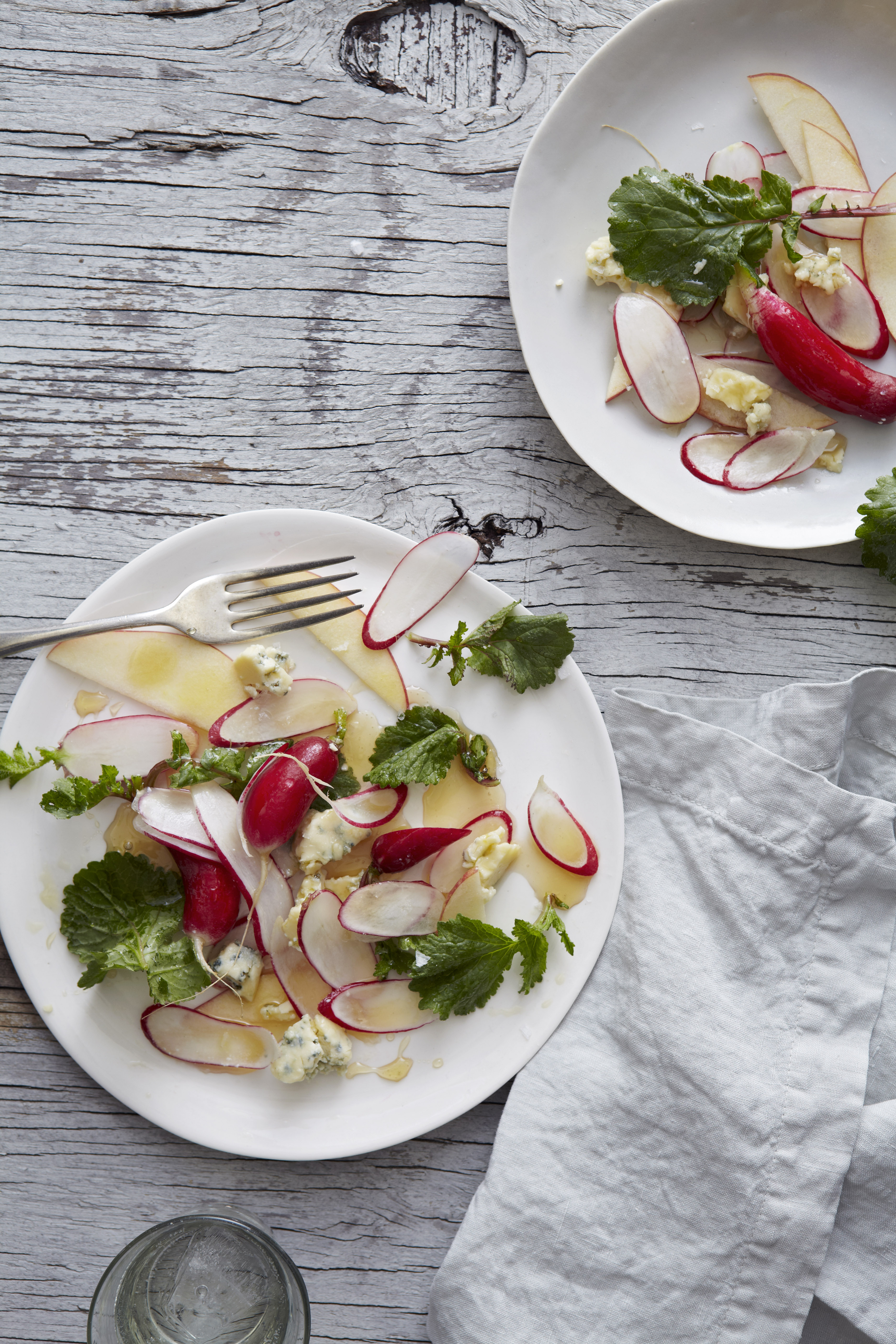 Using the knife or mandoline, cut the radishes into very thin rounds and add to the bowl with the apples. Rinse the radish tops thoroughly, if using, tear into bite-size pieces, and add to the bowl. Crumble the blue cheese into the bowl. Drizzle in the olive oil and a good pinch of salt and gently toss everything together. Throw in some whole radishes if you have some particularly beautiful specimens.
