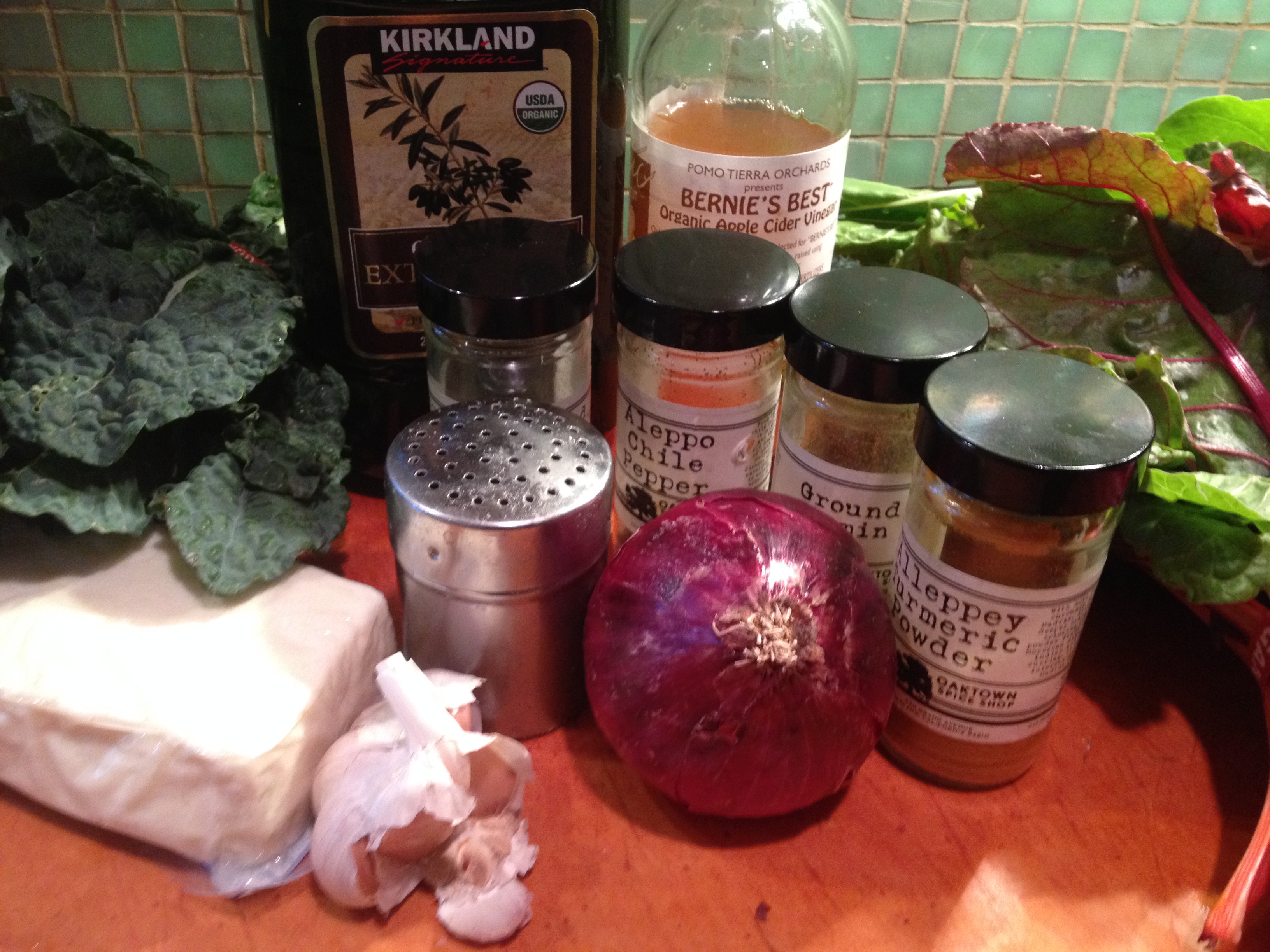 Strip the kale leaves from their stalks and blanch in boiling water for two minutes. Drain in a colander and chop into small bits. Strip the chard from the stalks and chop the stalks into dice. Add the olive oil to the pan you blanched the kale in and add the onion and chard stalk to the pan and sauté until wilted. Add the chard leaves, smashed garlic, and kale leaves. Saute until chard wilts. Add cider vinegar and a cup or so of water. Turn the heat down a bit and continue cooking adding water as necessary so that it doesn’t dry out. Once you’ve got this going, cut the paneer into ½” by ½” by 2” pieces. Mix the 1/3 cup olive oil and spices together and whisk. Add the paneer to this. Pour out on to a sheet pan covered with parchment paper and roast for 20 minutes at 400° for 20 minutes. Check at about 15 minutes to see how it’s doing. When the paneer has a good light brown look to it, take it out. Put the greens on a plate and top with the paneer.