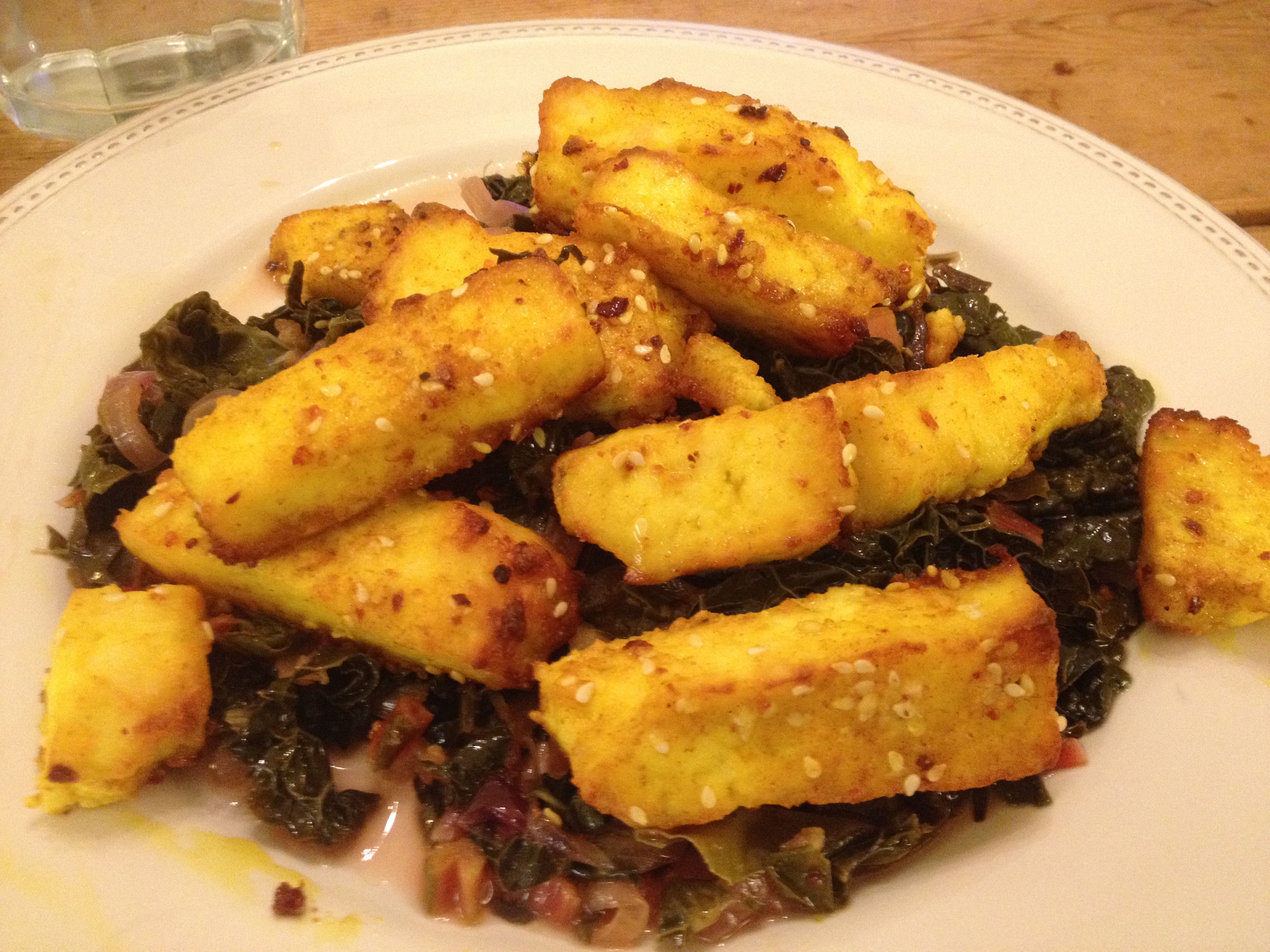 Saag Paneer is a standard Indian dish consisting of fried paneer, an Indian cheese, on a bed of sautéed spinach. This is my variation. I’ve got a couple of go-to recipes for quick meals that don’t take a lot of time or work but are presentable enough for guests and this is one. A fave not just as a vegetarian spin, but also because it’s very tasty.  I usually keep a block of paneer in the fridge and pretty much always have some greens, onion, and garlic around, so it’s on the table in half an hour.