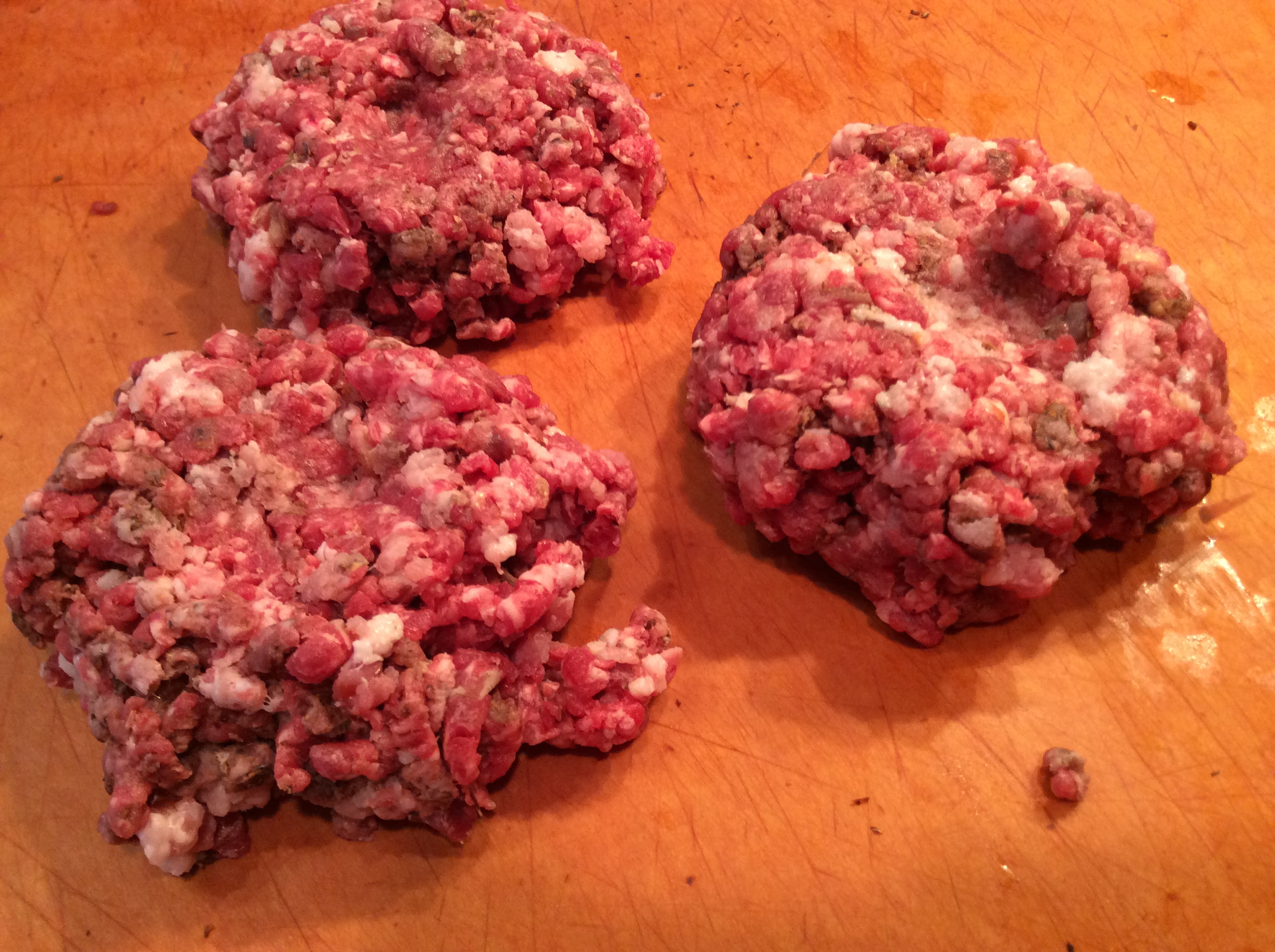 Grind the meat on the biggest holes on the grinder adding beef, bacon, and mushrooms pieces alternating between them so that it’s all mixed up.  Working quickly, form the ground meat into patties being careful not to work them too much.  I like to put sort of a dimple in the middle of the patties to aid in even cooking.  If you’re not going to be cooking them right away, stick them in the fridge until you’re ready.  Just before you cook them, add salt & pepper.  You don’t want to salt them too far ahead of cooking as it will pull moisture out and they will steam instead of frying.