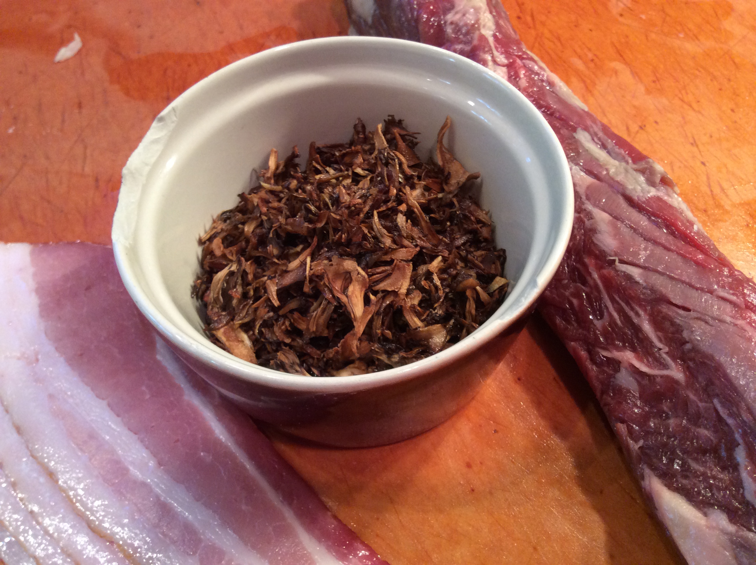 I like to use hanger steak for the beef.  Also known as onglet or butcher’s steak, it is a cut that is particularly rich.  A good substitute is short rib, but try to get English Cut short ribs as they are easier to work with.