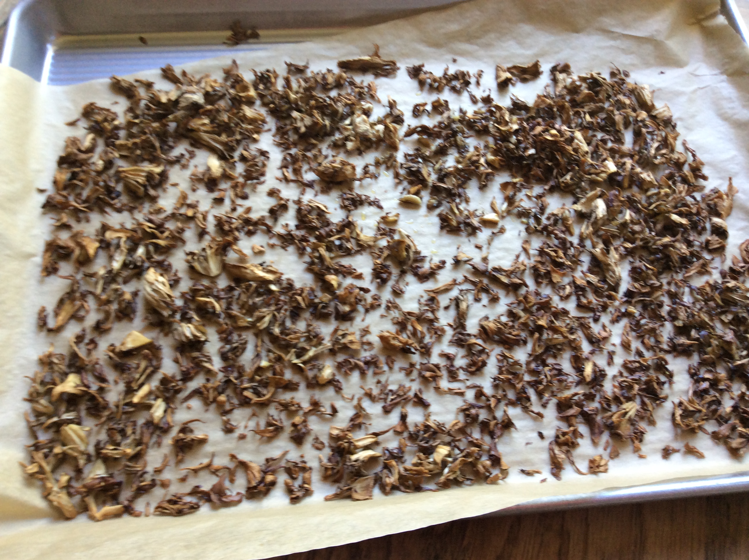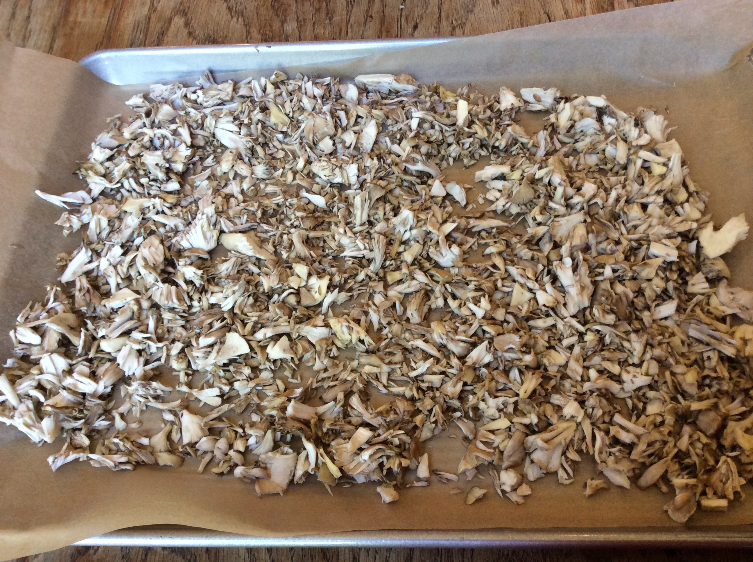 To make the dried maitake mushrooms, chop them into little bits and toss with a tablespoon or so of olive oil.  Spread on a parchment paper-covered sheet pan and roast for 30 minutes at 350°.  Check to make sure they’re dried out and then turn off the oven and let them stay in there another half an hour (at least).  You can make a bunch of this and it’ll keep well in a jar.  This ingredient is a great way to add a bit of earthiness and umami to a dish.  It goes well with beans, rice, and rubs for pork.