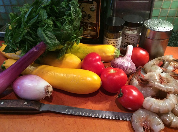 I’ve used shrimp in this version but I’ve also made it with fried squash blossoms and basil, eggplant, and fried green tomatoes. Cheese is another option. The dry-farmed Early Girl tomatoes have finally come into the market from Dirty Girl and Quetzal or you could use roasted cherry tomatoes.