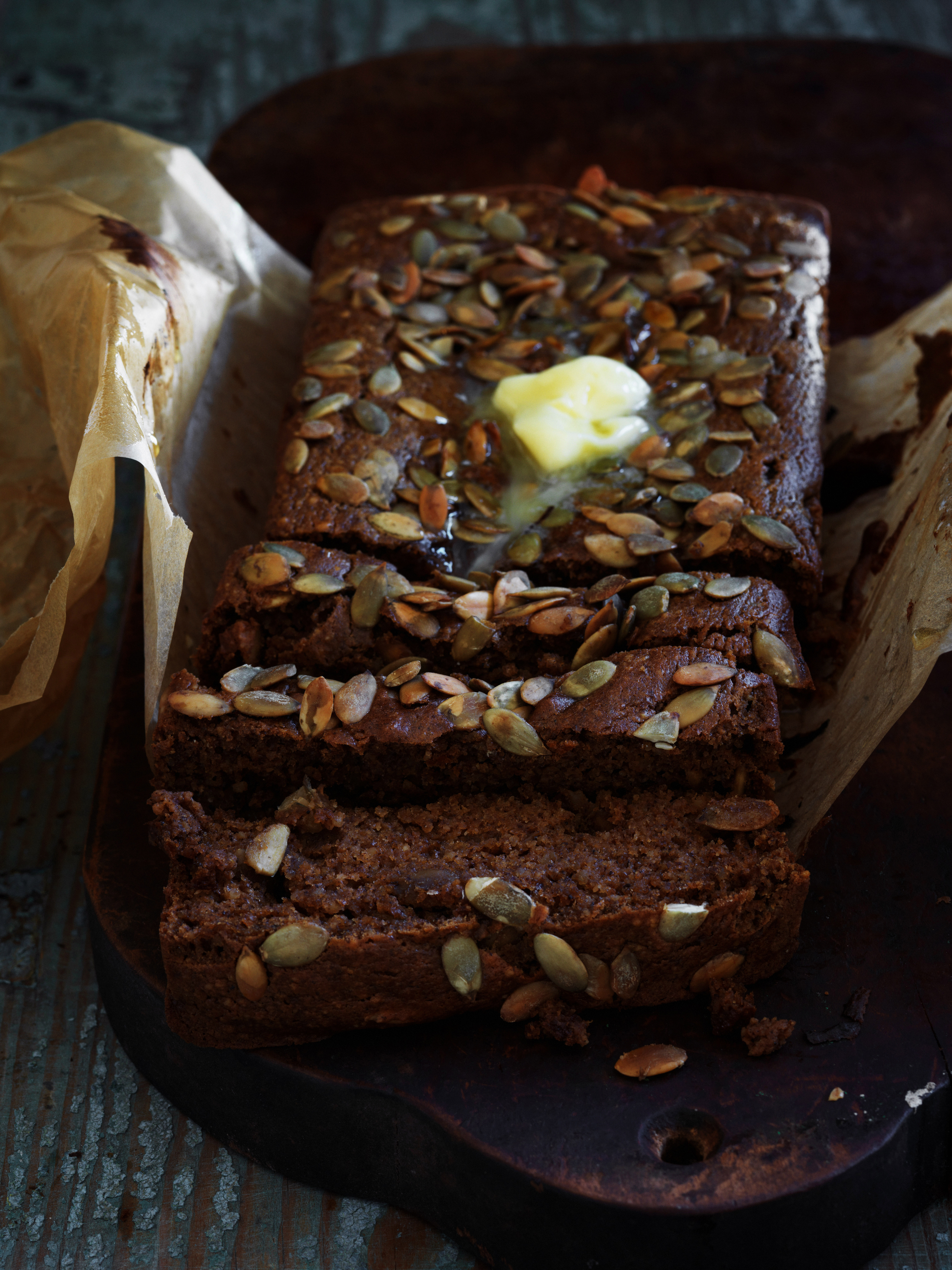 For this lightly sweetened, maple-scented loaf, scattering sliced almonds or pumpkin seeds across the top of the batter makes for a nice presentation and adds a welcome, extra layer of texture. It’s a luscious late-morning snack, topped with melted butter, or partner to tea in the afternoon, especially on cool, windy fall days.