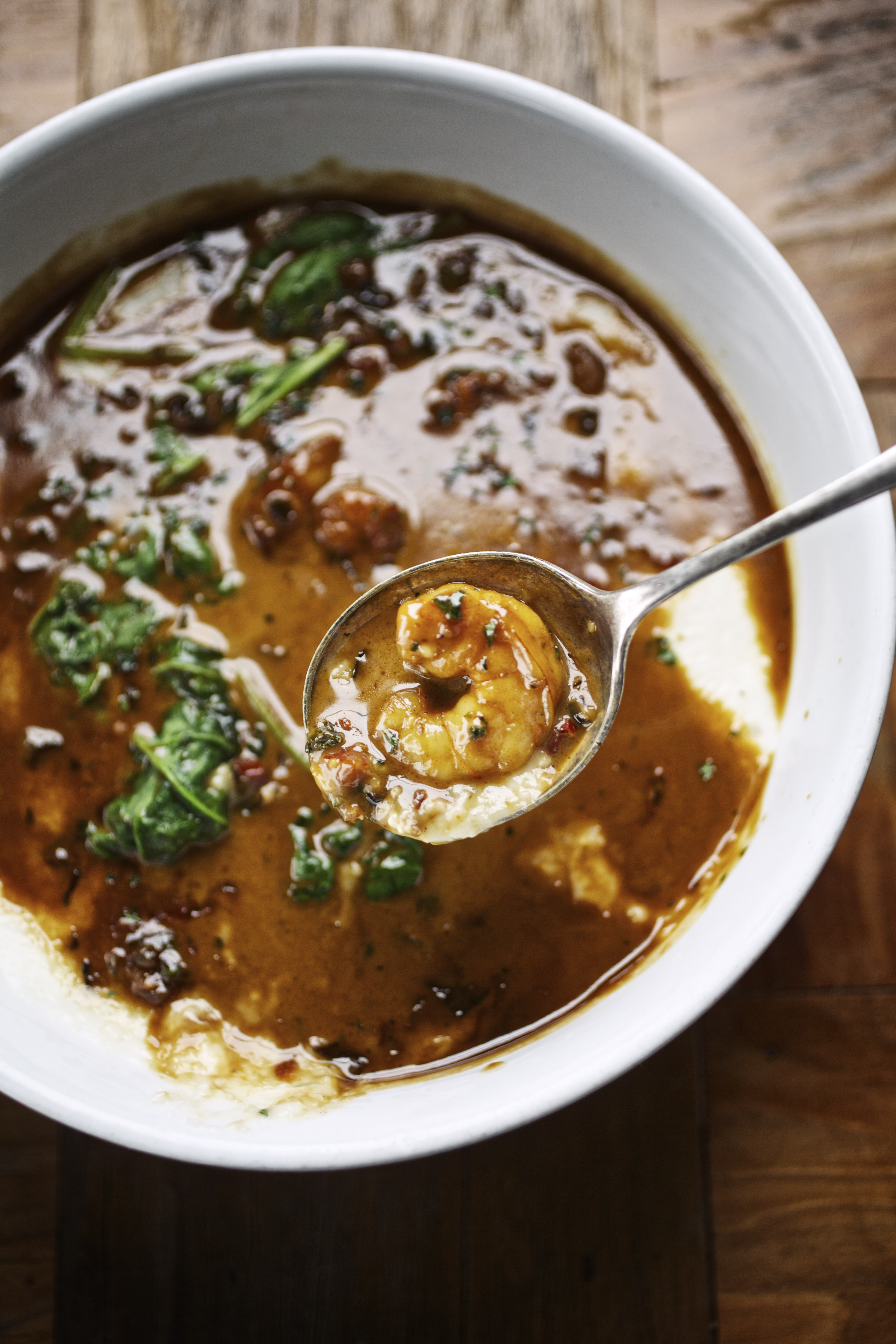 In a large sauté pan, heat the oil over medium heat until shimmering. Add the green and red bell peppers, green onions, garlic, and the Creole Spice Mix, and cook until the vegetables are softened, about five minutes. Add the shrimp and sear just until opaque, turning once, about two minutes. Stir in the Creole Sauce, cream, and butter, and bring to a simmer. Add the spinach, a handful at a time, stirring to wilt and coat with sauce. Once all the spinach has been added, remove the pan from the heat and stir in the lemon juice. Serve immediately over the grits.