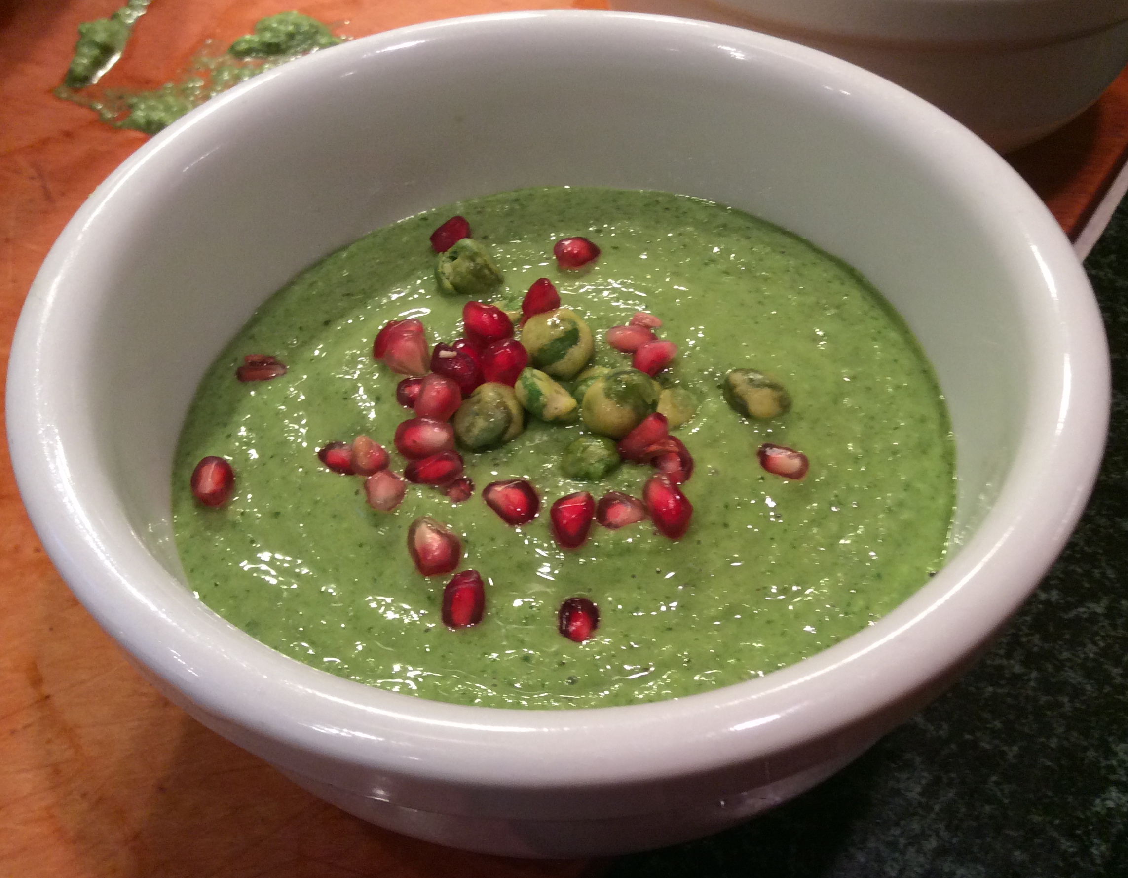Put as much as will fit in the blender—if you have a normal blender, that should be about half—with half of the remaining ice cubes, and mix until it’s really creamy. Mix the other half with the remaining ice cubes and whirl that around until it’s done. Keep in the refrigerator until ready to serve. Garnish with arils and wasabi peas (or avocado chunks and something else), and serve.