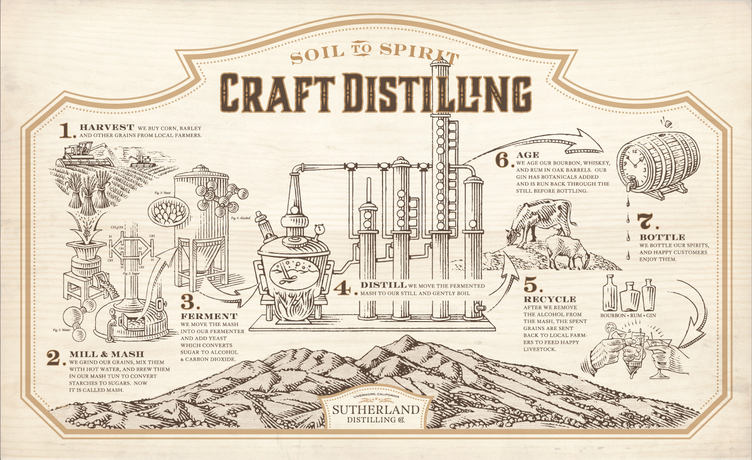 The owners of the distillery are two brothers and “the other guy.” That would be Ryan, his brother Barry Sutherland, and good friend Eric Larimer. Their motto is “Ordinary Guys, Extraordinary Spirits.” Taking their “soil to spirits” philosophy to heart, everything that goes into the distillation process is grown or sourced nearby. They even provide a handy chart, outlining the entire process. I sampled a bit of the 90 proof rum, and my eyes may have bugged out a little. “Not used to drinking it straight?” he asked. Nope. Make mine a Dark and Stormy.