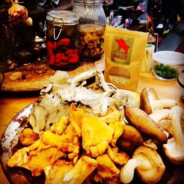 Salon dinner still life: Cal’s quickles with chanterelles, shiitake and oyster mushrooms for his mushroom pasta, along with Angelo Garro’s Omnivore Salt.