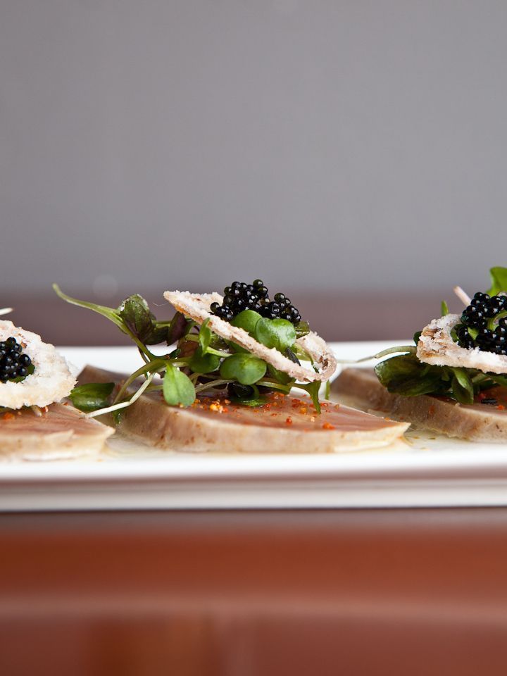 After a refreshing and flavorful Iceberg cocktail (Junmai sake, fennel, yuzu—a Japanese citrus— and green tea ice), our first dish was Albacore Tuna Tataki: seared albacore tuna, sudachi (another type of Japanese citrus), shallot-shiso vinaigrette, micro greens, and fried garlic. This blend of flavors—delicately balanced, textured, and beautifully presented—was an excellent way to start. Our next dish consisted of assorted sashimi: yellowtail, ocean trout, and tuna. Following Tim’s lead, I dipped each tender and deliciously fresh piece of fish into my tiny bowl of soy sauce. (Fish + soy sauce= OK; already perfectly seasoned sushi + soy sauce= not OK, as per mural instructions.)