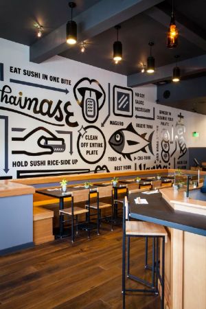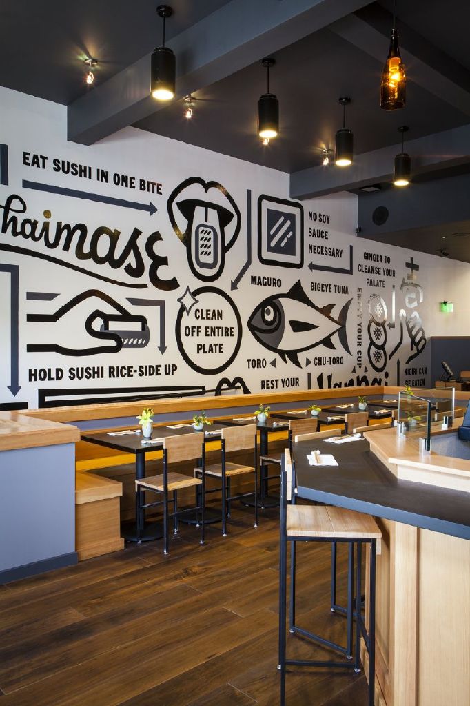 I arrived before the doors opened, and a small crowd had already gathered on the sidewalk. Once I got inside, the staff welcomed me (“Irasshaimase!”) as they prepared for the evening’s guests. I took a moment to study the mural on the large wall to the left, which instructs diners on the proper etiquette of eating sushi. The mural’s vivid graphics depict the do’s and don’ts of sushi consumption: eat in one bite, rice side up, no soy sauce, clean your entire plate! As Erin describes it in the “Mural Project” video on the ICHI Sushi website, the mural is intended to be “accessible and light-hearted.” As Tim puts it, the mural illustrates the way sushi and sake are consumed in Japan. Artist Erik Marinovich adds, “The illustration style is bold, simple, clean and fun, with a little wink.” And for those who are new to this type of food, the mural is friendly, instructive and playful. (Now that I understand the proper method, no more “two bites” for me.) Another wink: look below the smiling tuna for a tip on the proper place to rest your chopsticks.