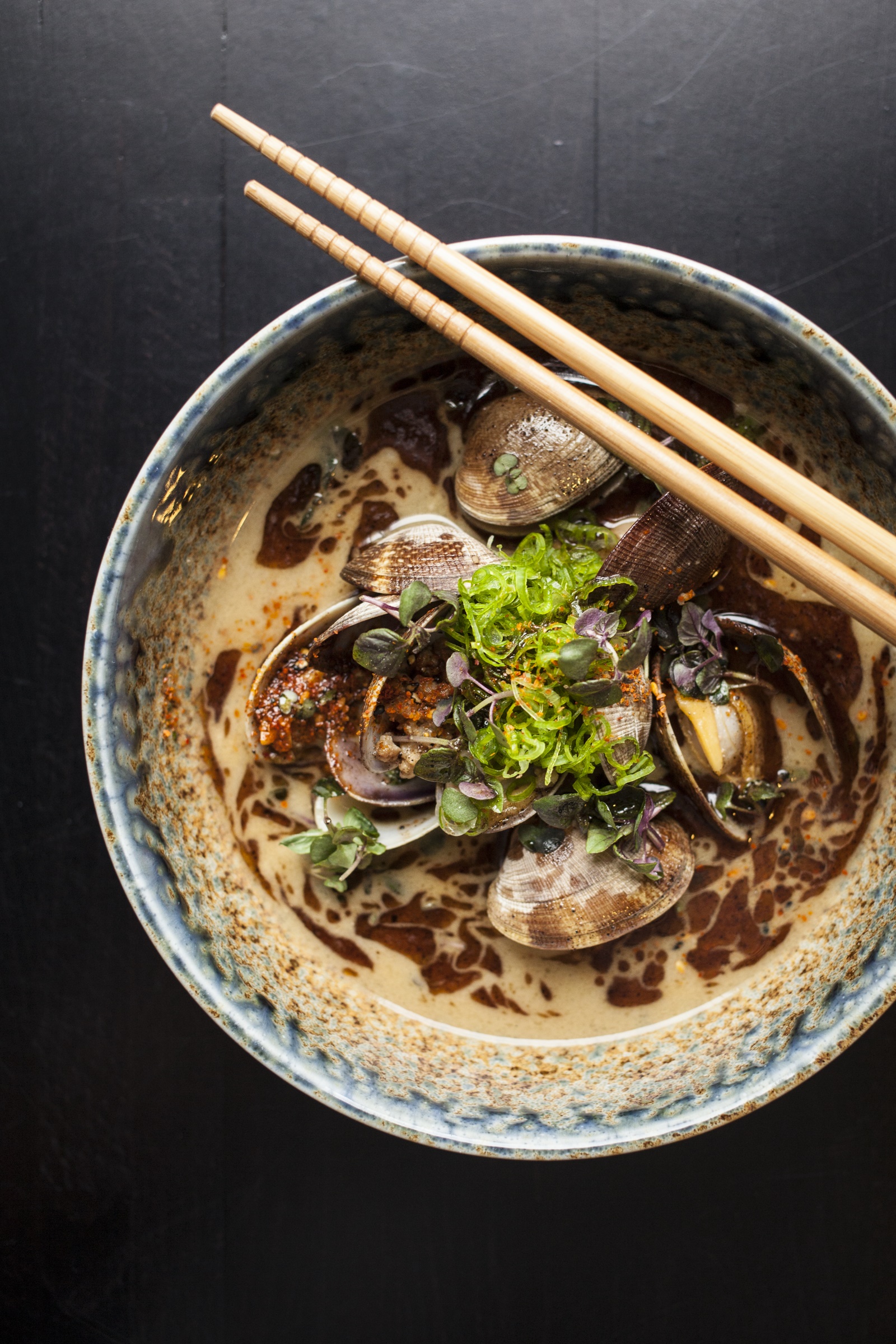 The Miso Asari clams—a bowl of clams, ground pork, and burnt garlic kuro oil in a rich broth— came out next, and my reaction to the explosion of tastes made Tim laugh (which is actually easy to do—he laughs a lot, as does Erin). “That’s the reaction we want to our food,” he said. This dish was included in San Francisco Chronicle restaurant critic Michael Bauer’s 2014 list of Top 100 Dishes, and it would make it to my list too, if I had one. The dish is so layered and flavorful, I had to balance my eagerness to eat it with my reluctance to arrive at the final spoonful. The combination of ingredients, surprising and perfectly paired, add up to create an unforgettable taste sensation.