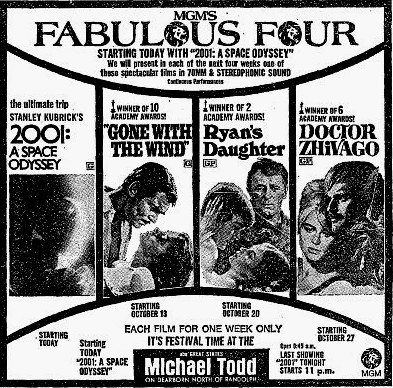 Fabulous 4To take advantage of the specialness of the format, someone at MGM got the wise idea to create a 70mm mini festival and offer a package called “MGM’s Fabulous Four.“ When I worked for United Artists Theatres, we could depend on this as a successful filler between regular bookings. Ironically Dr. Zhivago  and Ryan’s Daughter  were blow-ups from widescreen 35mm, and the 1939 Gone With The Wind was a blow-up from the old square format, resulting in the heads often being cut off to create a widescreen appearance. Only 2001 was truly a 70mm film.