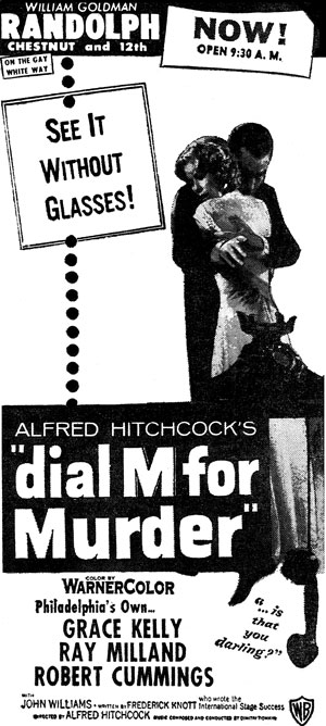 On Sunday May 23, a Philadelphia Inquirer headline proclaimed: “Play’s the Thing as Philadelphia Fans Spurn 3-D for 2-D Version of DIAL M.” Mildred Martin wrote: “The first audiences proved to be a jury that could not only make up its mind, but could make it up in a hurry. In exhibitors’ own terms, DIAL M literally died. And after just four performances on Wednesday, some long-distance telephoning to report complaints, the increasing skimpiness of customers–a good many of them making no bones of their dissatisfaction–permission was given to throw away the glasses and hastily switch to the 2-D version. Whereupon business at the Randolph took a turn for the better.” It then became a box office success and in two years the 3-D fad had faded.