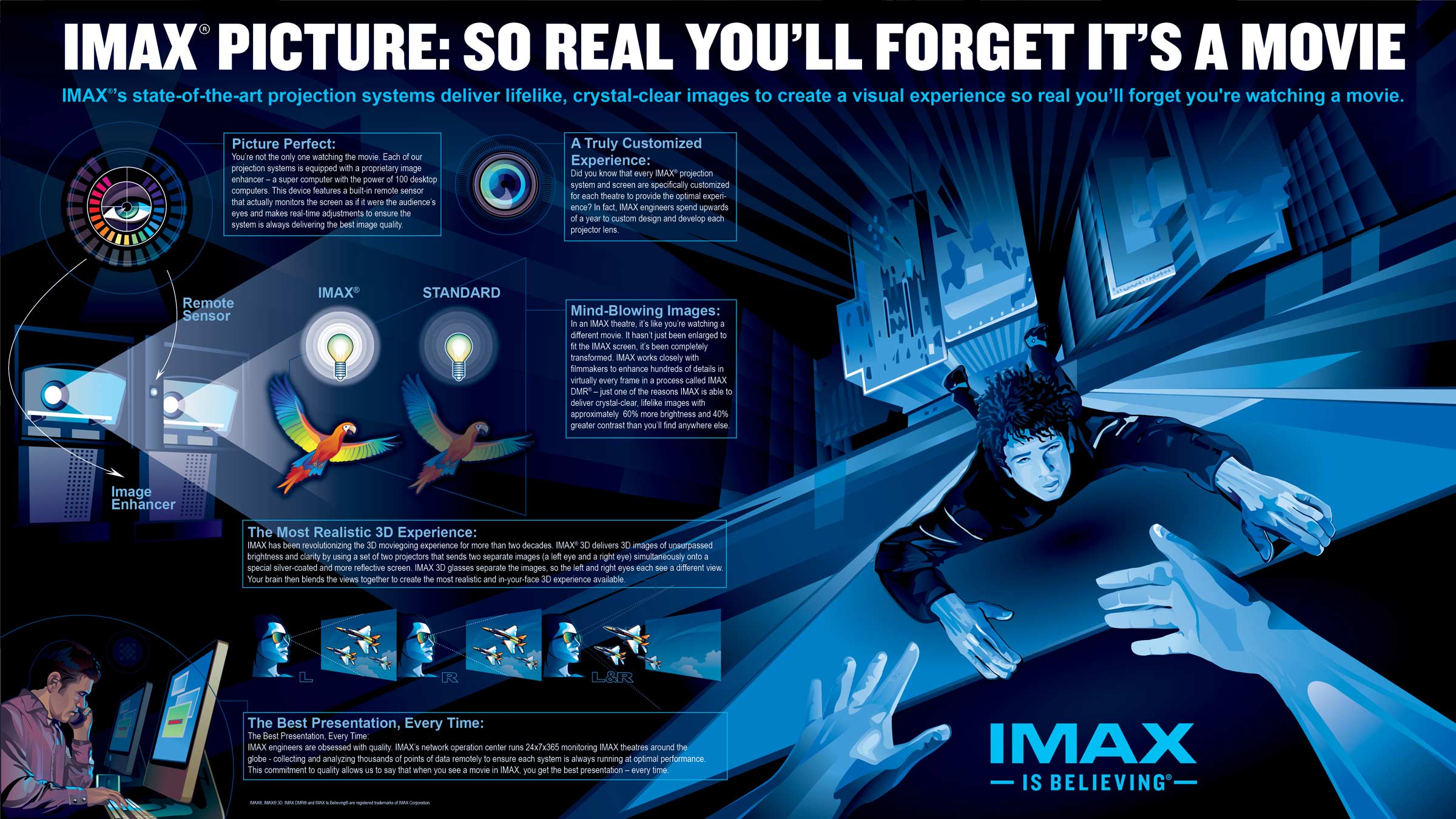 A large part of the IMAX experience is sound. I remember once being invited to IMAX headquarters in Toronto when they were working on a more realistic sound presentation. Headphones were built into a pair of 3-D glasses. They asked me to close my eyes and listen. I heard a racecar speeding towards me, suddenly seeming to pull behind me. It came to a screeching stop, apparently turned around and came back at me, this time passing in front of me. I fully expected to feel a breeze. Next a female voice told me to relax. Moments later someone was clipping my hair with scissors. I slapped at the back of my head but nothing was there except the sound that was moving around my neck and I would have sworn someone was cutting my hair.