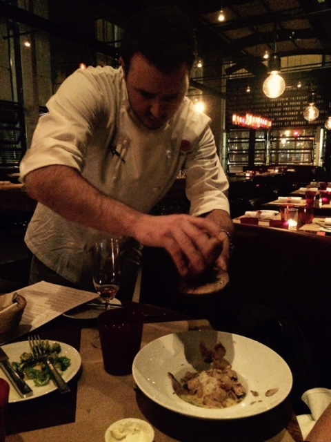 Adam Sobel of RN74, shaving tartufo bianco over egg yolk and ricotta filled ravioli. Photo by Cari Borja