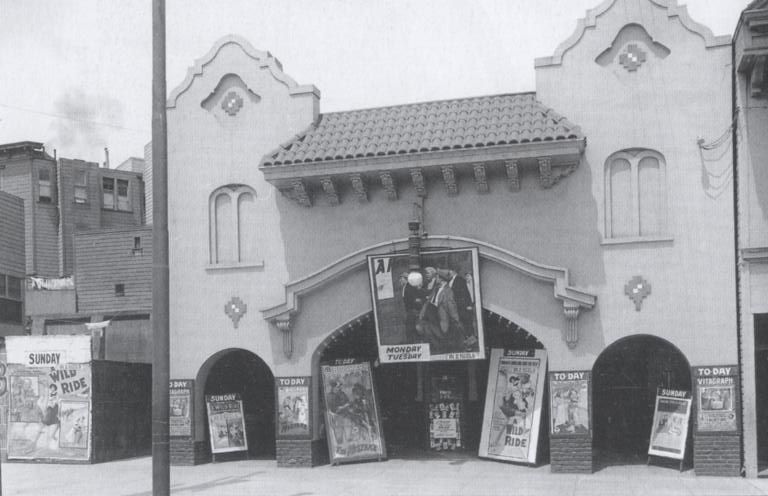 No two nickelodeons were alike; they ranged from the elegant to the fleapit. Trade journals crusaded for high-class theaters, encouraging managers to accompany movies with themes from classical and semi-classical music. But many of the pianists were recruited from dance halls and brothels, left to improvise the music they knew best. In San Francisco, the Barbary Coast provided a rich supply of honky-tonk and ragtime musicians looking for part-time work. What movies to show, what live acts to put in between, and how to arrange them all were decisions left to the individual theater owners—who generally improvised like mad. The only rule was to entertain the audience with as much variety as possible and cram into the tiny auditorium the maximum number of shows. When our Vogue Theater started life as The Elite, it sported about 400 seats; today it stays within the nickelodeon average with 220.
