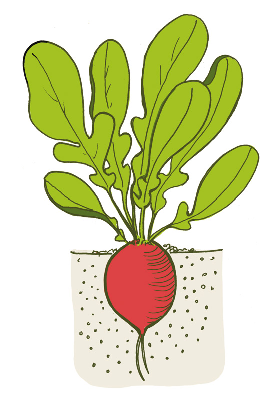 Radishes are another quick-growing spring crop, and they require full sun and well-drained soil. Sow the seeds into loosened soil two weeks before the last spring frost, and do successive plantings every week until early summer. Radishes grow very quickly, and some varieties are ready for harvest only three weeks after they’re sown. Radishes taste best if they have plenty of moisture, so make sure to mulch over the plants to keep weeds down and moisture in. Pull the radishes up as soon as the roots are mature.
