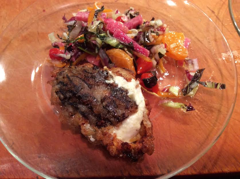 To serve I made a quick chopped salad of chopped chicories, watermelon and red radishs, kumquats, peppers, and Mandarin orange sections with a simple dressing of good olive oil, lime juice and salt and plopped the mushroom next to it.