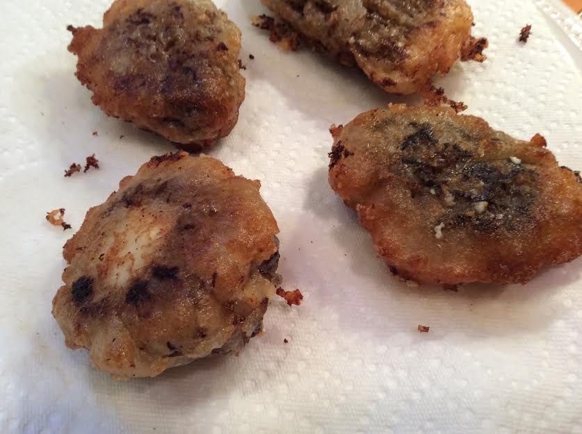 Working quickly, dip the stuffed morels in the batter and then into the hot oil. I usually cook them on three sides, so when the bottom is brown and crispy (this should only take a couple of minutes) turn them on the side and repeat until all sides are brown.