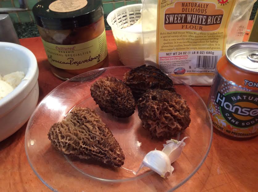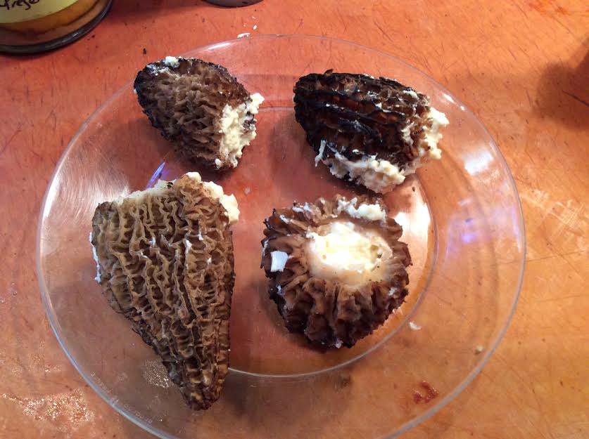Clean the morels in a bit of water and trim the bottoms. Let dry on paper towels.