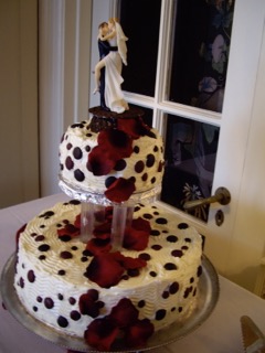 Another modern couple wanted brown polka dots. The florist refused to give me any red roses assembled richly for the reception, so the hostess tore into bags of fabric roses, and that is what I used.