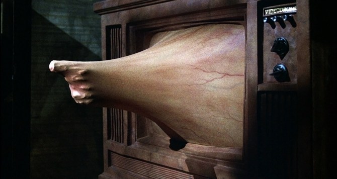 Between them, Cronenberg made the singular Videodrome , in which his obsession with the body as mutating pawn of reckless technology reached new surrealist heights—or depths, depending on your view. In it, James Woods is the driven president of a sleazy cable TV network that has eked out a pandering niche programming little but “softcore sex and hardcore violence.” When he (and Blondie’s Debbie Harry as a radio advice columnist) discovers foreign transmissions of presumably staged torture/snuff tableaux, he decides they’re “what’s next” for his envelope-pushing channel. What he doesn’t realize is that he’s stumbled onto (or been lured into) a conspiratorial quasi-religion promoting a “New Flesh” in which hallucination, assassination and mutation are no longer distinguishable.