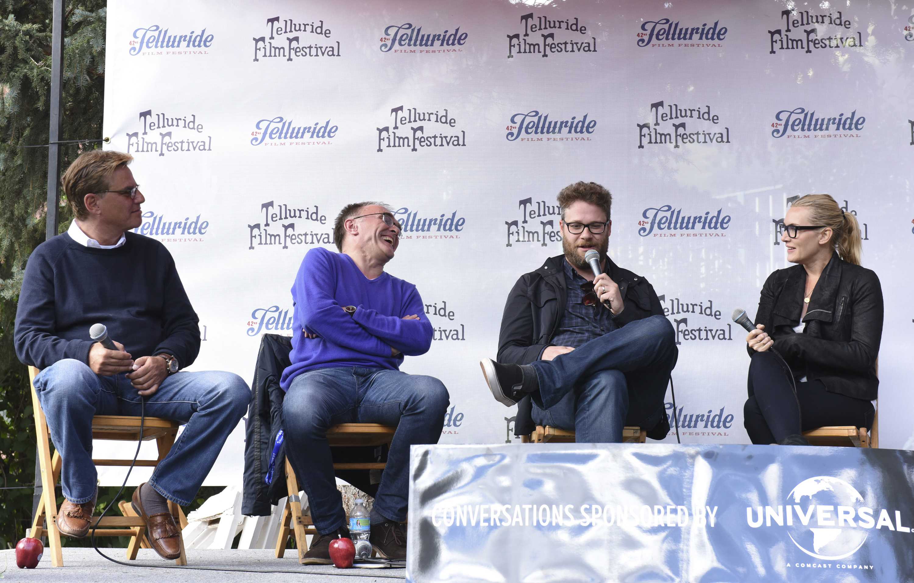 - Writer Aaron Sorkin, director Danny Boyle, Seth Rogen and Kate Winslet discuss Steve Jobs. (Photo: Vivien Killilea, gettyimages)