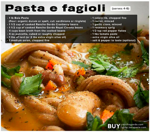 (flour: organic durum or spelt, cut: sardinians or ringlets)- 1-1/2 lbs. cooked Rancho Gordo cranberry beans