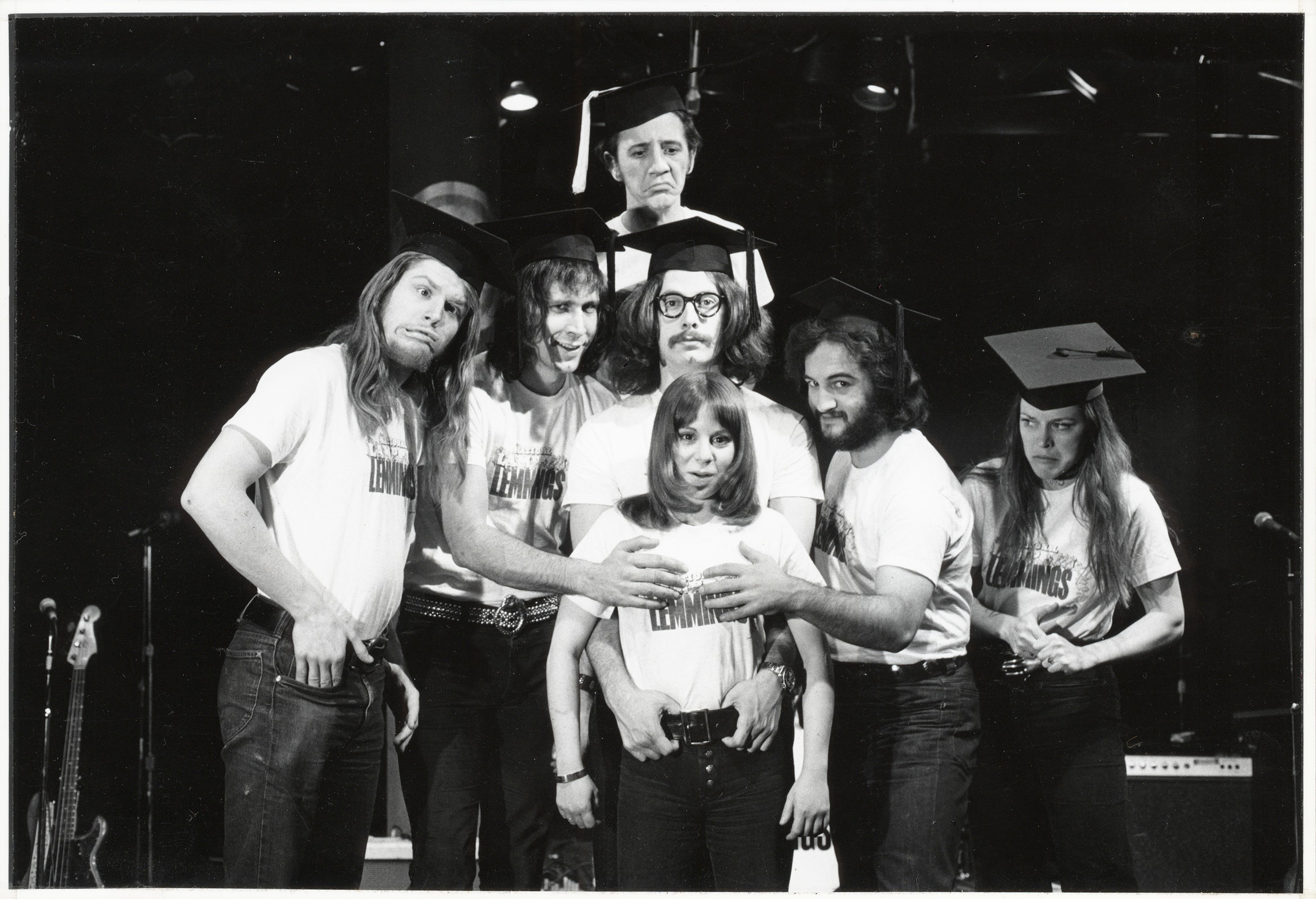 Garry Goodrow, Peter Elbling, Chevy Chase, Chris Guest, John Belushi, Mary-Jennifer Mitchell and Alice Peyton . (Photo courtesy of Magnolia Pictures. Photo: National Lampoon)