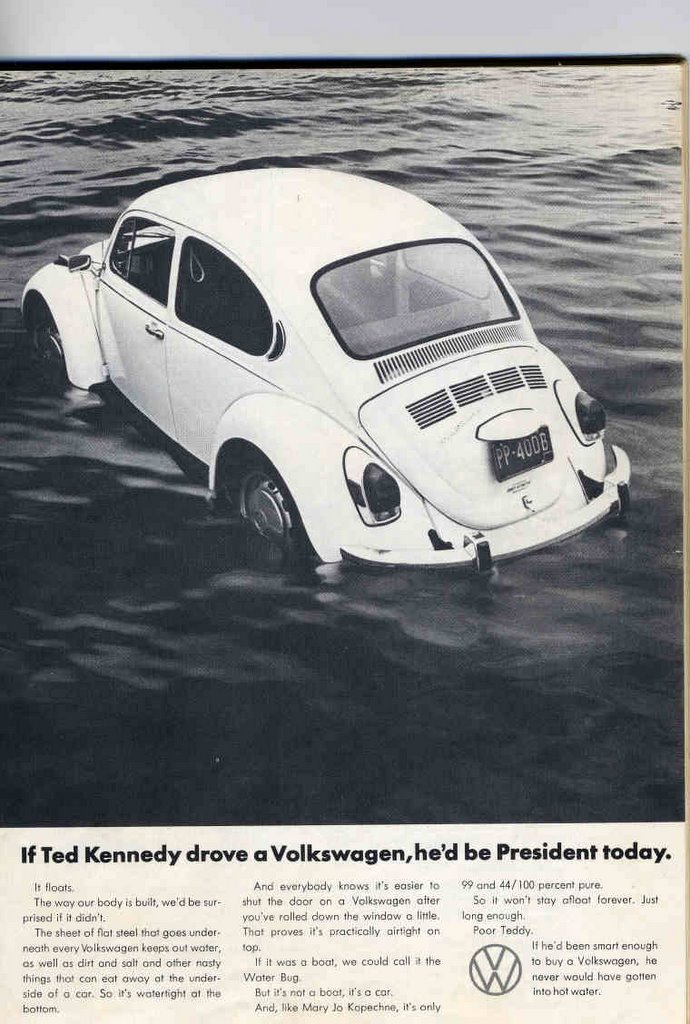 Another contributor, Anne Beatts, was a dazzling writer. Her coup de grace was a fake Volkswagen ad. The illustration was accompanied by her headline: “If Ted Kennedy Drove a Volkswagen, He’d Be President Today!” Which actually is true. The senator was doomed never to inhabit the White House, because he accidentally drove off a bridge on Chappaquiddick island off Massachusetts into the water, and managed to swim free, leaving behind his passenger, Mary Jo Kopechne, who drowned, but not if he drove a Volkswagen Beetle that floated.