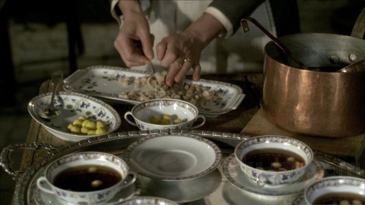 “To complicate matters, some of the actors were finicky eaters who refused to suck the brains from the quail heads as the script called for, until the chefs crafted a brain-like substitute out of marzipan, a paste made from almonds and sugar,” writes Steve Zimmerman in his book Food in the Movies.