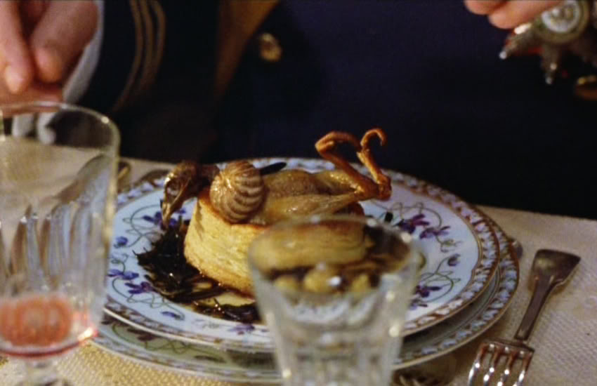 Stéphane Audran who played Babette loved to cook and said it was easier for her to do the cooking on screen with authority. ”More important was that the director, Gabriel Axel, is a lover of fine food and could translate this passion to the screen,” the actress explained. Except for the finishing touches that Miss Audran tackled on screen, the actual food for the film was prepared by La Cocotte, a restaurant in Copenhagen. Jan Pedersen, the chef, and two assistants were on the set for two weeks. For the Caille en Sarcophage (literally “quails in coffins” which was the nineteenth century term for “encased in puff pastry”), reshooting scenes resulted in the preparation of 148 quails for the dinner to serve 12. The film makers spent $8,000 on the food.