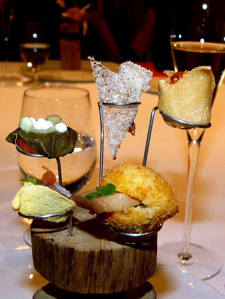A group of appetizers that represent international dishes that have impressed Joan Roca and his brothers. The tastes were from Mexico (a miniature burrito with mole poblano and guacamole), Peru (ceviche broth), China (pickled vegetables with plum cream), Morocco (goat yogurt with almond slivers, honey, saffron, ras el hanout, and rose petals), and from Korea (panco fried bread, bacon with soja sauce, snow peas, kimchi, and sesame oil). (Photo by Manos Angelakis, Epoch Taste)