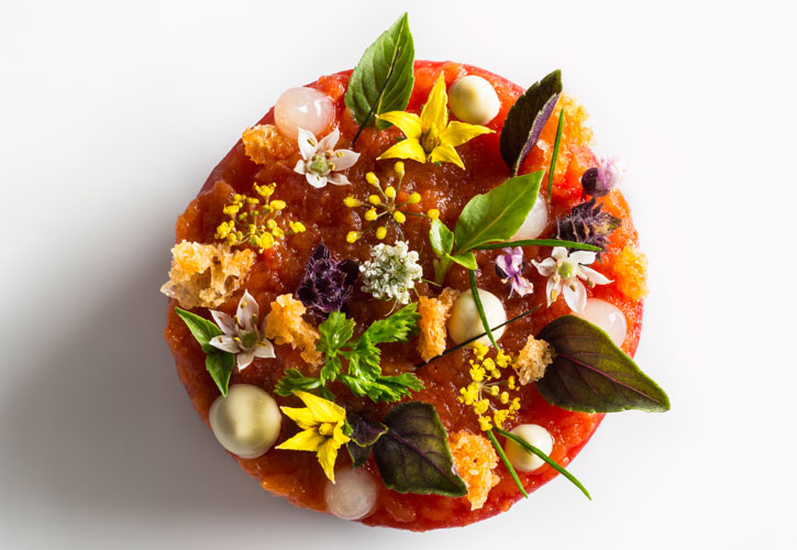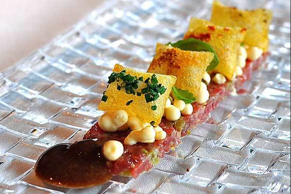 Steak tartar with mustard ice cream at El Celler De Can Roca. (Photo by Cathy Chaplin for Gas•tron•o•my) Their delicious cuisine is mature and splendid. It is the yield of the evolution of different trends that have become entwined, giving birth to dishes with a tremendous intellectual charge that are executed with technical and aesthetic perfection beyond the ingredients used to make them.