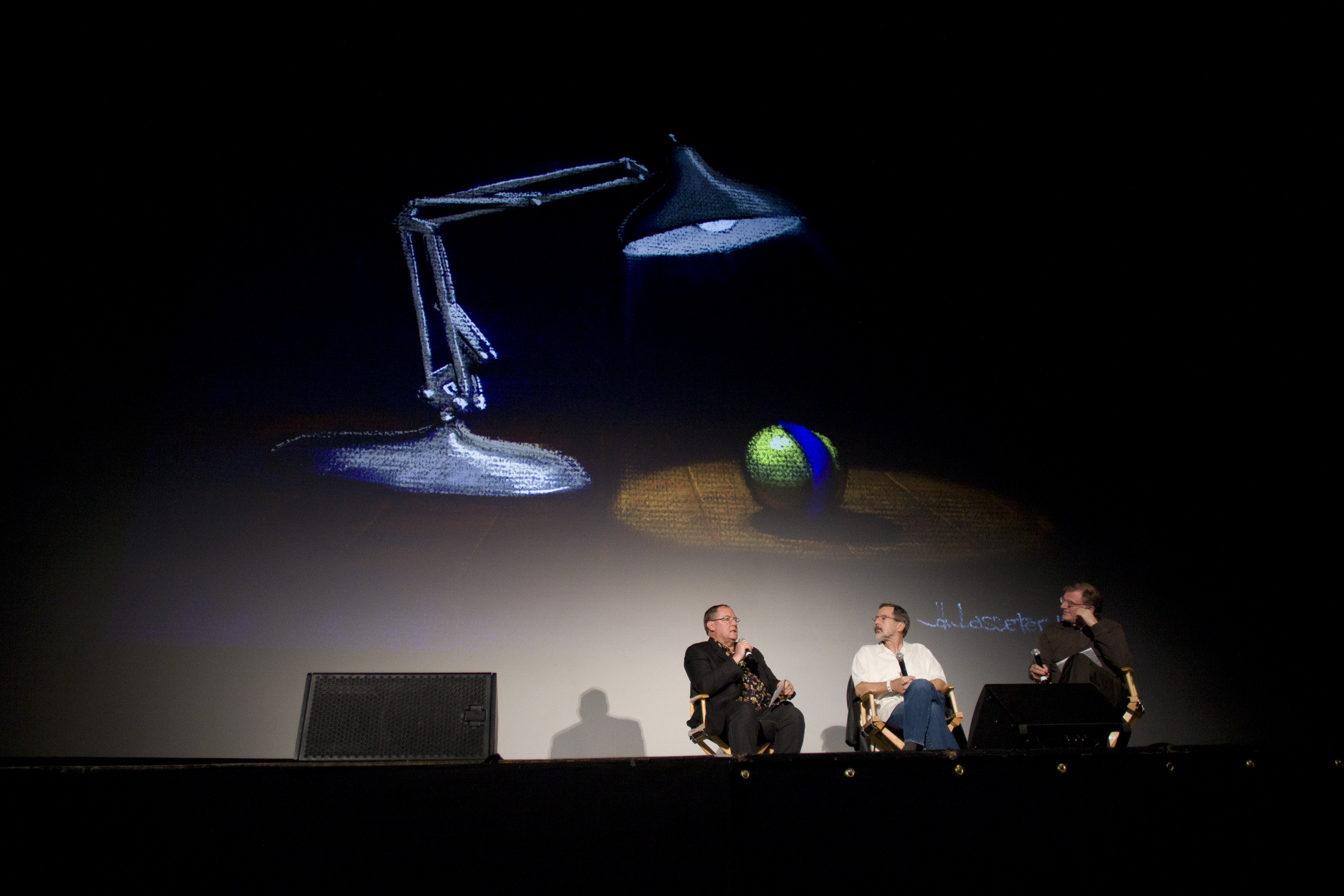 John worked long hours on the demo reel including pulling all-nighters where he ended up sleeping on the studio’s floor in a sleeping bag (a photo of John in a bag was shown to prove that story was true). The demo reel was called Luxo Jr. (1986) and when it was shown at SIGGRAPH ’86 John said the audience “went nuts,” they were “blown away.” Luxo Jr. went on to win an Academy Award nomination and other honors.