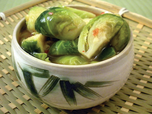 Blanch brussels sprouts in a kettle of boiling, salted water until tender, about 5 minutes. Drain, rinse with cold water, and set aside. Combine all ingredients in a large jar with a tight-fitting lid, add brussels sprouts and rice vinegar, using a little extra to cover if needed. Refrigerate for 2 hours, turning occasionally for even marinating. Serves 4.