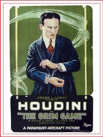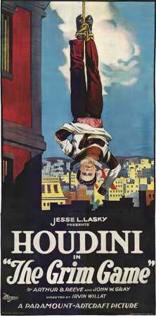 In the early spring of 1919, in the wake of the Great War, he headed to Los Angeles, where he signed with a first class studio, Famous Players-Lasky, whose stable of luminaries included Mary Pickford, John Barrymore, and Rudolph Valentino. He was in the big league now, with a star salary of $2500 a week, plus an interest in the picture. Houdini helped shape the script of The Grim Game to take advantage of his reputation for coolness, ingenuity, daring, and athleticism (he may have gotten a little thicker in the midsection in his mid-forties, but he still moved like a panther.)