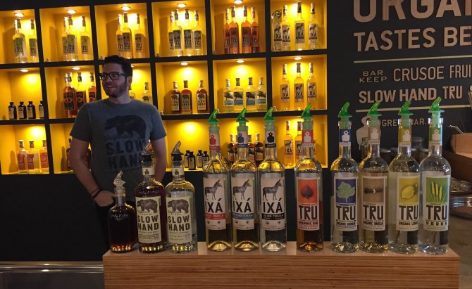 The house-made spirits are attractively displayed around the room, along with T-shirts and hats that sport the Slow Hand logo.