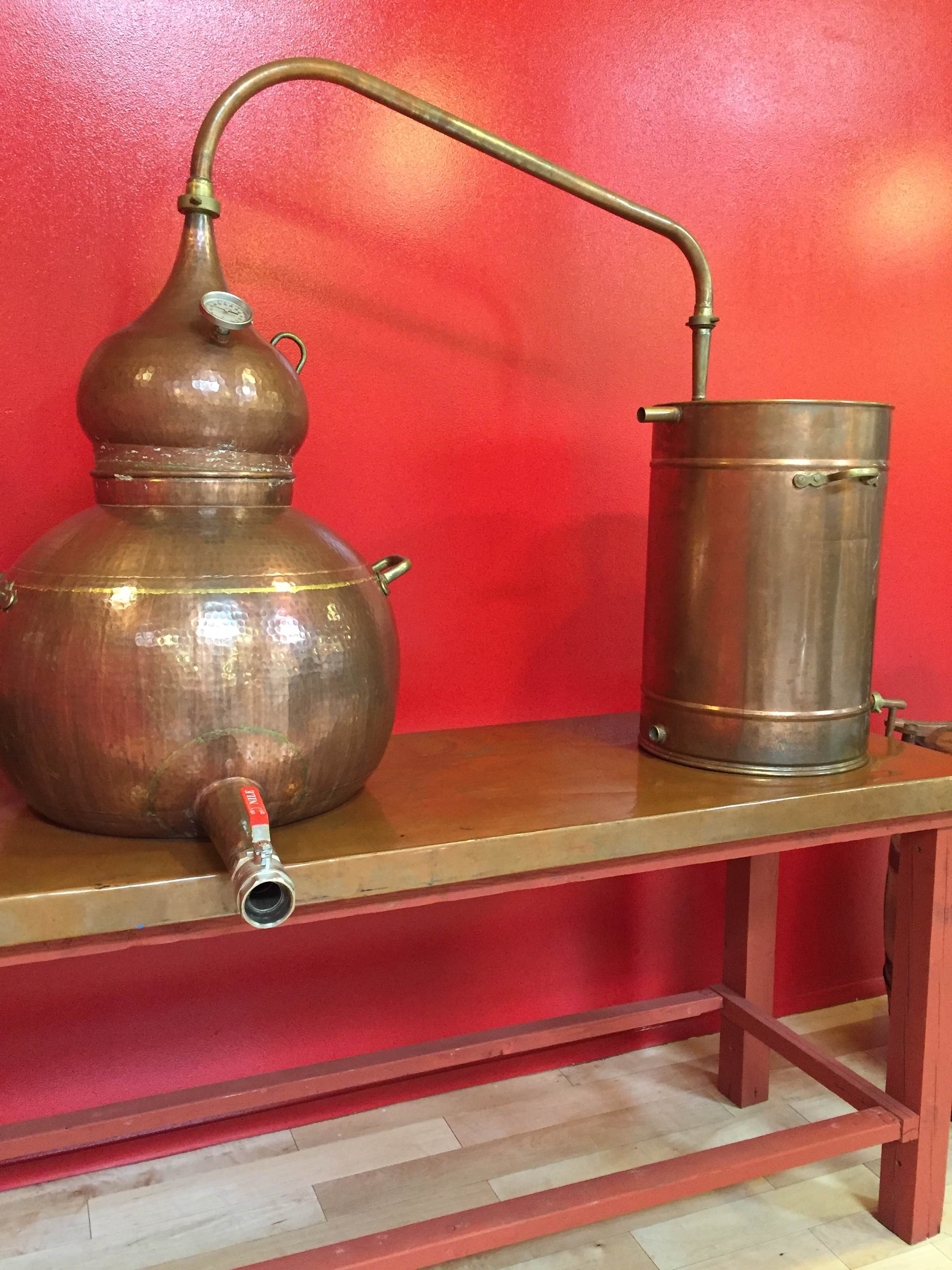 Our highly informed tour guides Drew and Katie filled us in on the entire distillation process and showed us around the stills located on the floor below the tasting area. The large copper “pot still” reminded me of one of those old-fashioned deep sea diving bells, with legs. Standing tall next to it is a continuous fractionating column still, with several tall copper columns. We got a detailed explanation about how these stills work, and learned about the careful sampling and tasting that goes on throughout the process.