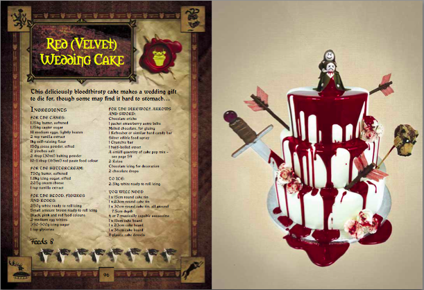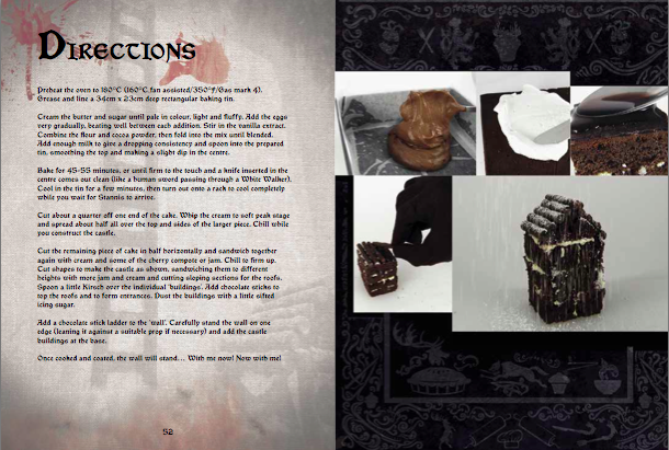 The allusions and humor are carried through in the actual recipes, all of which are marked “Easy,” “Medium” or “Hard.” For example, in addition to ladyfingers, cream and almonds, Littlefinger Cake calls for “a network of spies throughout the kingdom and a low moral threshold.” Jaqen’s Chocolate Coins are introduced thus: “Speak the name and a man will make a snack.”
