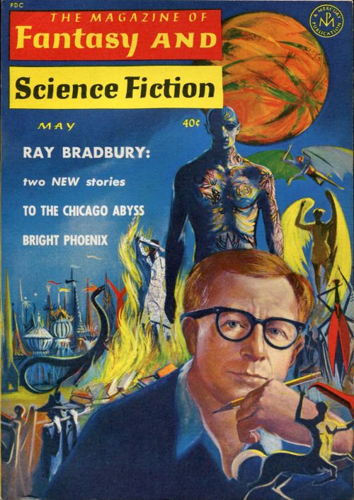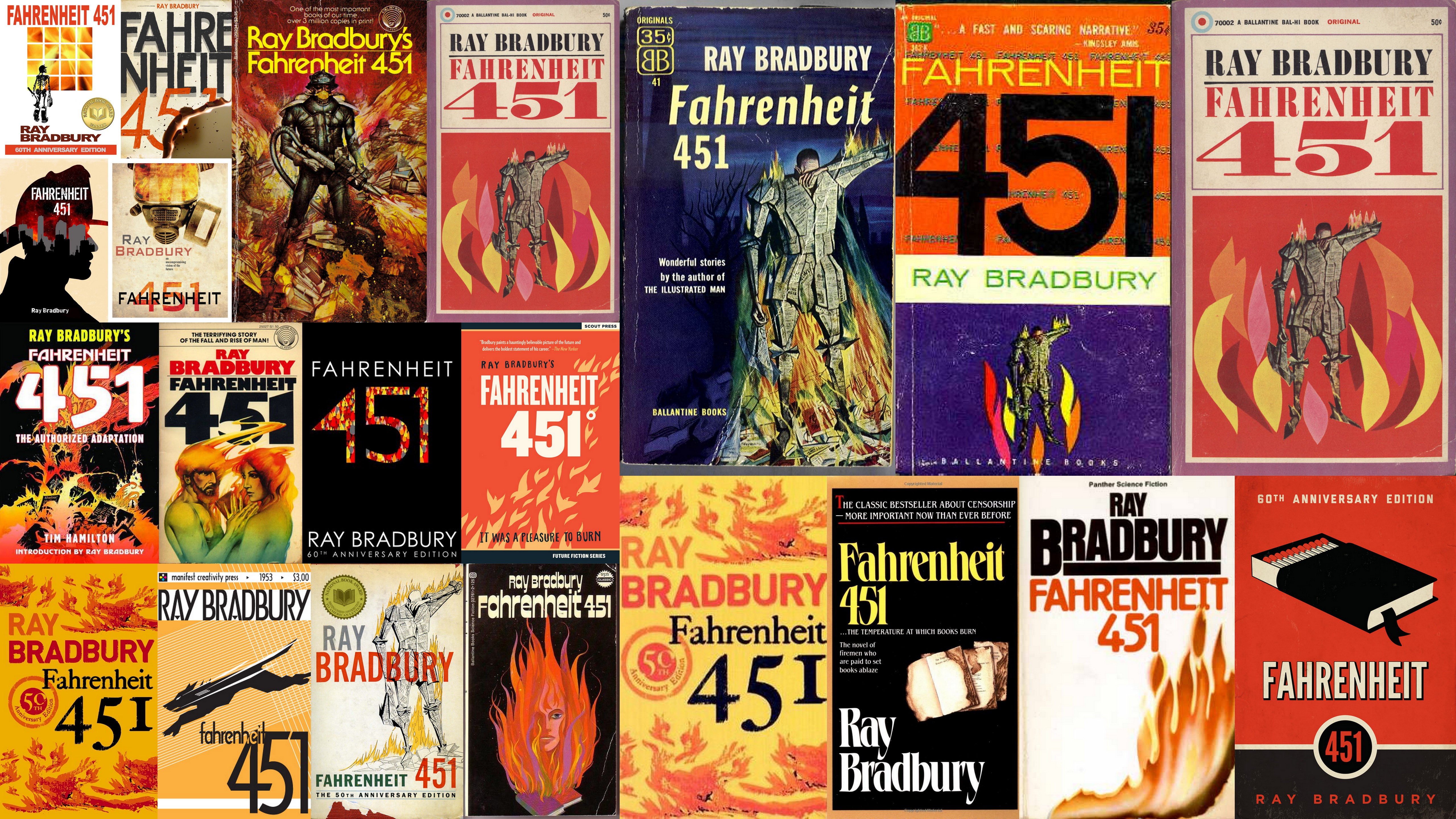 Fahrenheit-451The covers of Ray Bradbury books are quite wonderful. His works are always being reprinted, each with new cover art. A web search gives you the bigger picture.