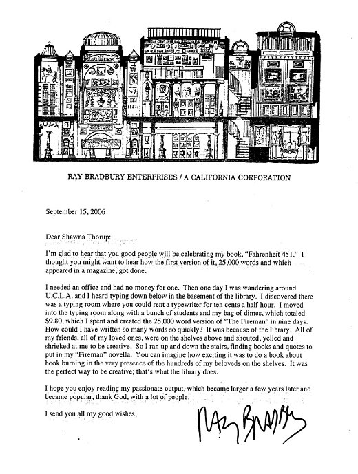 Ray Bradbury loved meeting his readers by appearing at bookstores, conferences and libraries (where he never charged a fee and let the library keep all the proceeds of book sales). It was always a joy to hear his passion for the things he cared about.