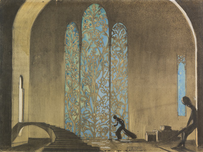 A soaring pattern of ornate grillwork stimulates interest in Douglas Fairbanks’ midnight approach in The Thief of Bagdad (1924). “They let me take one detail and feature the devil out of it,” said William Cameron Menzies. “That’s the way to get effects into pictures–height. That’s the one dimension that lets loose the imagination.” (Courtesy of the Menzies family collection)