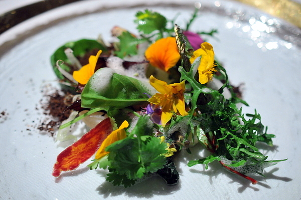 The Vegetable Garden was a showstopper, inspired by chef Michel Bras. The dirt was made of potatoes and chicory root granules, which was next layered with root vegetable purees, then bite-sized pieces of cooked vegetables, then delicate greens, then flowers and seeds. All topped with “dew” of frothed vegetable tisane.