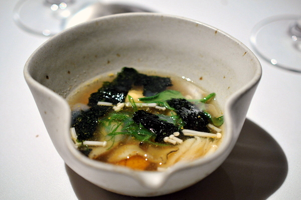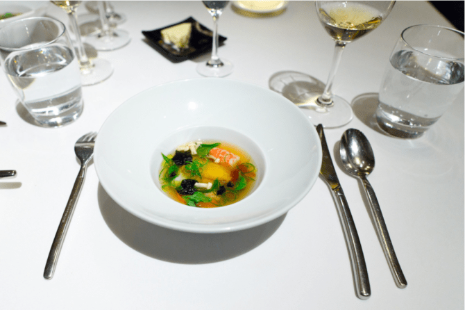 “A summer tidal pool – A David Kinch classic, a dish that has taken on various forms over the years. This was the best version yet. Chunks of Monterey bay abalone, sea urchin, foie gras, local spot prawn, and hinoki mushroom swimming in a beautifully salted dashi broth. It was as if chef Kinch took a list of my favorite Japanese ingredients and combined them into one dish. This was a simple dish with a very complex flavor; sweet sea urchin and prawns, buttery foie gras, meaty abalone, and earthy hinoki combined into a broth of absolute perfection. This is a dish where chef Kinch exercised culinary restraint, letting a simple dashi broth serve as the clean canvas for the natural flavors of the sea.”