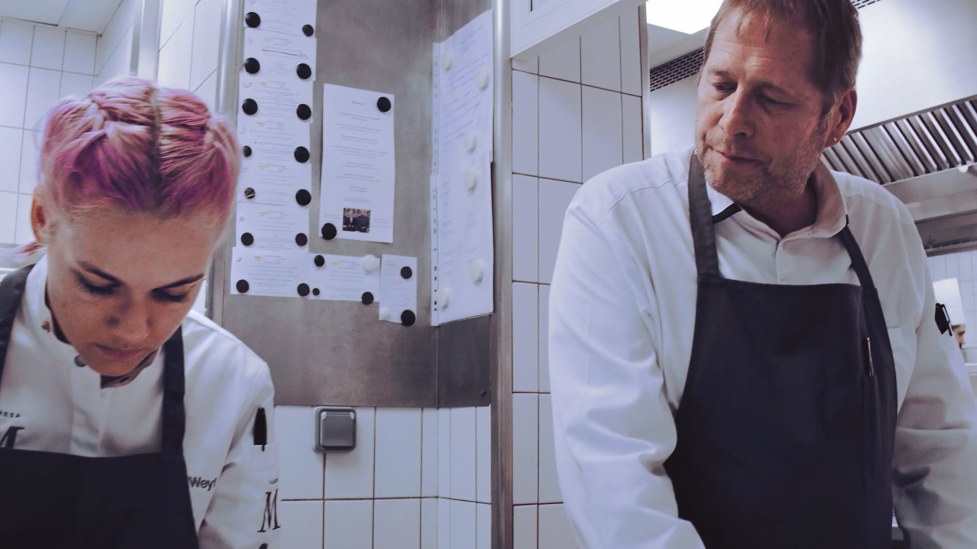 Le Taillevent kitchen-Chef Kinch observing Manresa’s Assistant Pastry Chef Courtney Moisant (Weyl)